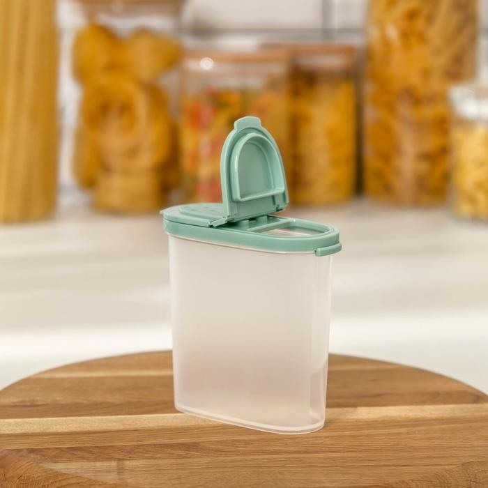 Банка для сыпучих продуктов изготовлена из пластика. Имеет плотно закрывающуюся крышку, которая защищает еду от влаги и посторонних запахов. В ёмкости удобно хранить крупы, специи, макаронные изделия, сахар, муку и бобовые.