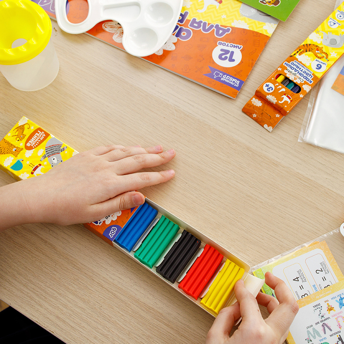 Альбом, Доска, Карандаши, Кисть, Клей, Краски, Ластик, Линейка, Ножницы, Обложка для тетради, Папка, Пластилин, Ручка, Счётные палочки, Тетрадь, Точилка, Фломастеры, Цветная бумага, Цветной картон