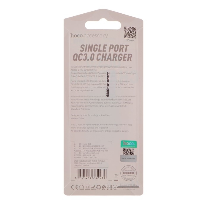 Сетевое зарядное устройство Hoco C72Q, 18 Вт, USB QC3.0 - 3 А, белый