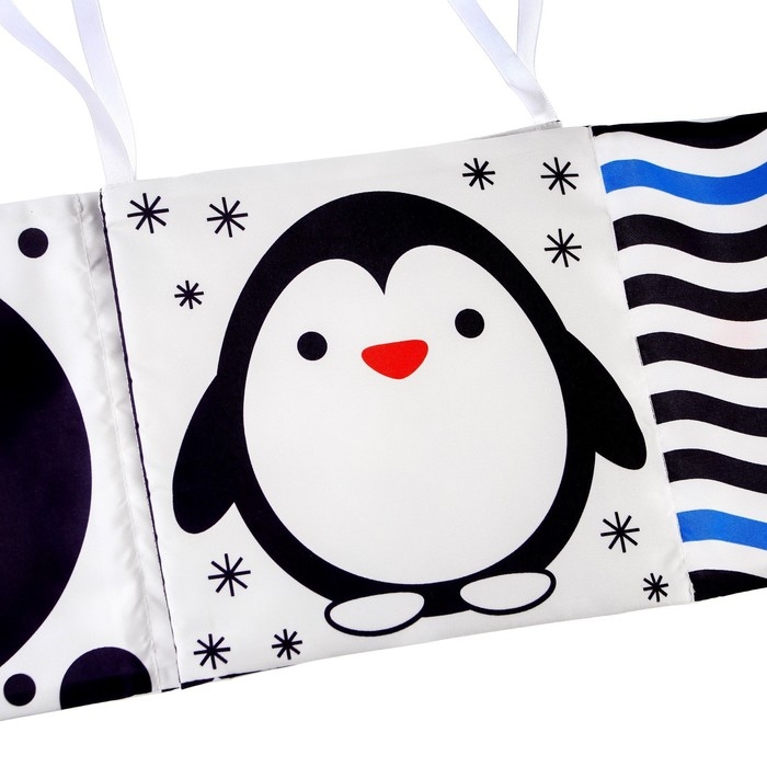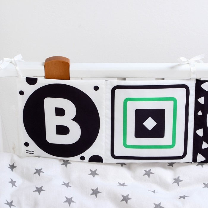 Мягкая книжка-бортик имеет красочные развивающие картинки, привлекающие внимание малыша. Книжка имеет ленточки за которые её можно подвесить на кроватку.