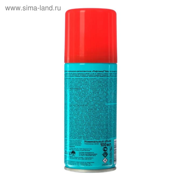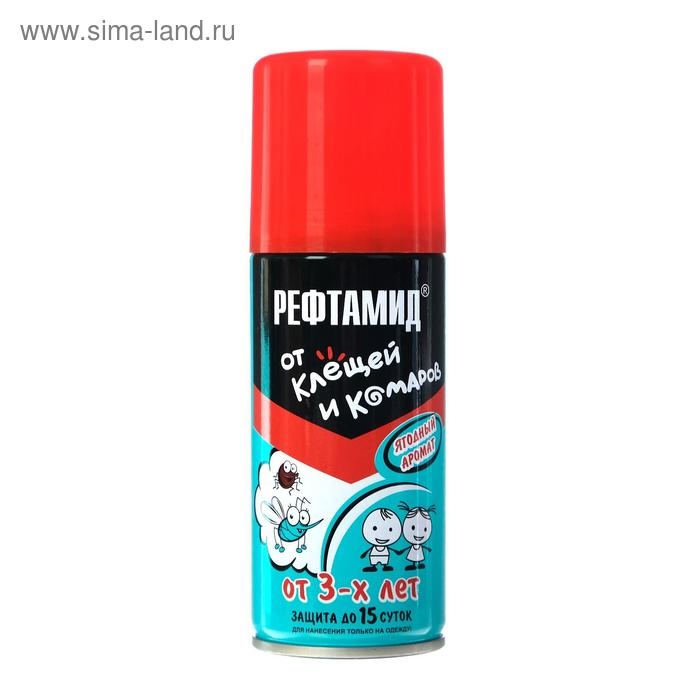 Аэрозоль репеллент Baby, от клещей и комаров, с ягодным ароматом, 100 мл Аэрозоль предназначен для защиты людей от клещей – переносчиков возбудителей клещевого энцефалита и других заболеваний – только при обработке одежды.Попадая на обработанную этим препаратом одежду, клещ получает сверхлетальную дозу, через 2 минуты клеща парализует, через 5 минут клещ погибает. Состав Действующим веществом препарата Рефтамид Beby является Альфациперметрин + Диэтилтолуамид (ДЭТА). Это бесцветное масло, почти не имеющее запаха, эффективно действует против широкого спектра членистоногих. Помимо того в состав репеллента входят:бутан/пропан/изобутан (15 – 30%) – сжиженный углеродный газ;пропиленгликоль (5 – 15%);отдушка с ягодным запахом;вода;вспомогательные компоненты.Способ применения Малышам от 1 года до 5 лет средство наносят исключительно на одежду, более старшим детям – на предметы гардероба и непосредственно на кожу. Для этого в начале спрей наносится на ладонь взрослого, откуда аккуратно переносится на открытые части тела ребенка: руки, ноги, шею, щеки, лоб. Аэрозоль рекомендуется распылять на открытом воздухе, держа баллончик на расстоянии 25 – 30 см от обрабатываемого объекта. Действие препарата на кожных покровах сохраняется на протяжении 2 часов. На одежде репеллент держится значительно дольше. В случае необходимости возможна повторная обработка, но не более двух раз в сутки.