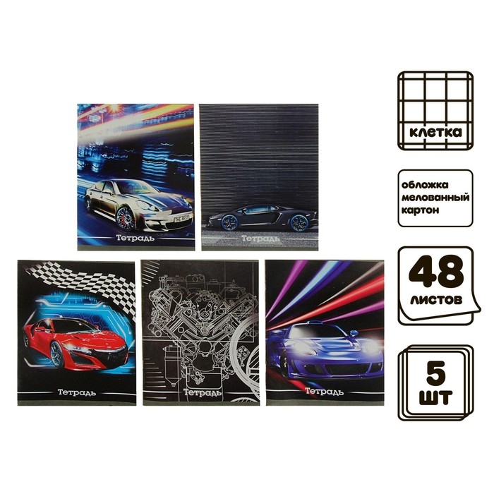 Комплект тетрадей из 5 штук, 48 листов в клетку Calligrata "Авто", обложка мелованный картон, блок №2, белизна 75% (серые листы)