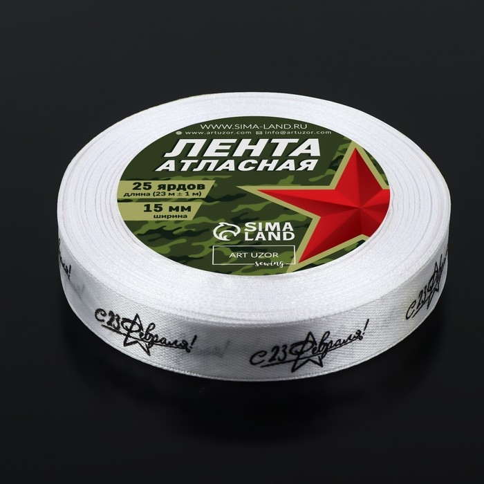 Лента атласная «С 23 Февраля!», 15 мм × 23 ± 1 м, цвет белый