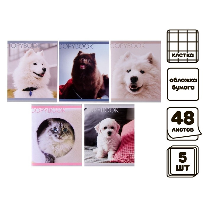 Комплект тетрадей из 5 штук, 48 листов в клетку Calligrata "Любимые питомцы", обложка мелованная бумага, блок №2, белизна 75% (серые листы)