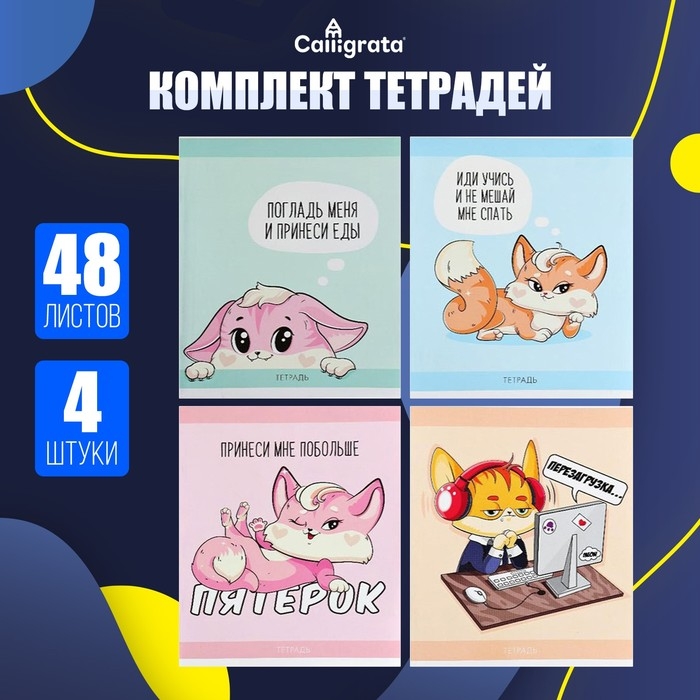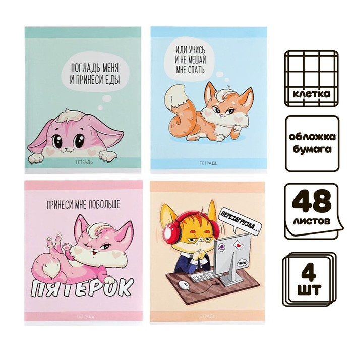 Комплект тетрадей из 4 штук, 48 листов в клетку Calligrata Лисички, обложка мелованная бумага, блок №2, белизна 75% (серые листы)
