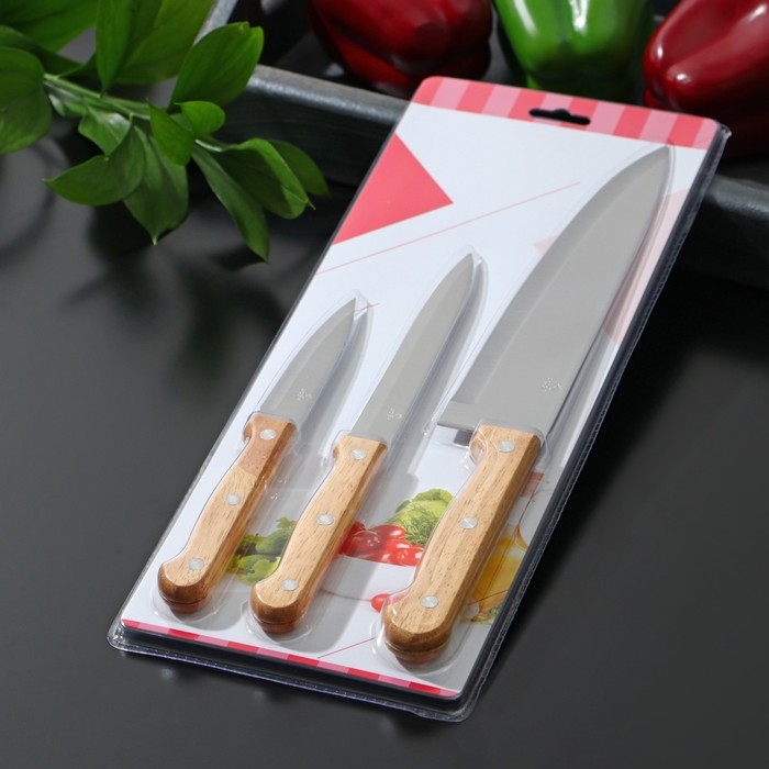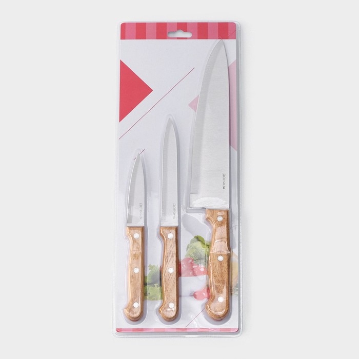 Набор кухонных ножей Доляна Wооd, набор 3 шт, лезвие: 8 см, 12 см, 19,5 см, ручка деревянная
