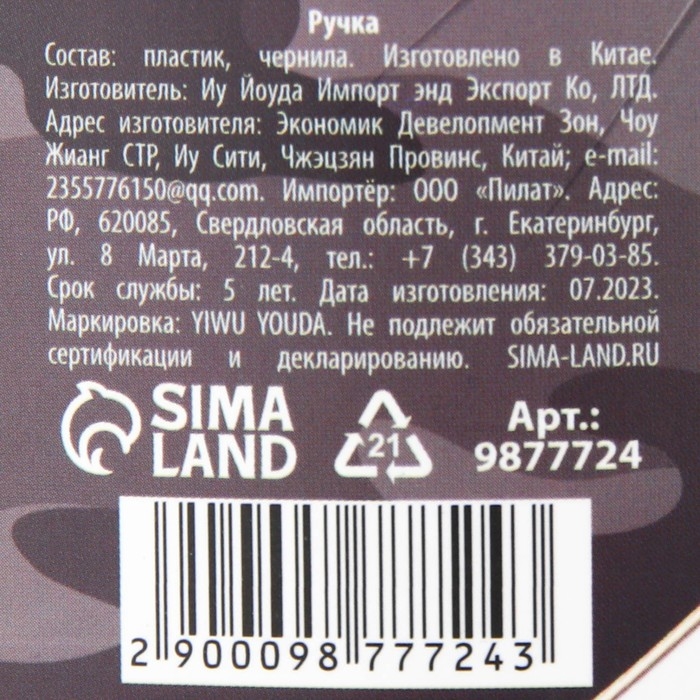 Ручка шариковая синяя паста 0.5 мм с подвеской автомат «23 февраля» пластик