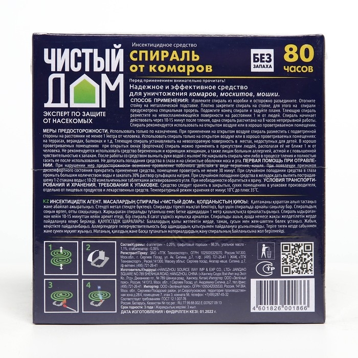 **Спирали от комаров "Чистый дом"** - это эффективное средство для борьбы с насекомыми, которые могут быть не только раздражающими, но и опасными переносчиками различных заболеваний. Они не содержат дыма и запаха, что делает их более приятными в использовании.**Способ применения**1. Извлеките спираль из коробки и осторожно разъедините.2. Отогните стойку на металлической подставке. Плотно закрепите спираль на стойке, для этого на изделии предусмотрена специальная прорезь.3. Подожгите конец спирали и задуйте пламя. Тлеющее изделие разместите на невоспламеняющейся поверхности на расстоянии одного метра от людей.**Важно помнить**, что спираль начинает действовать через 10-15 минут после начала тления. Одно изделие рассчитано на 10 часов непрерывной работы. Рекомендуется использовать спираль на открытом воздухе или в хорошо проветриваемом помещении.**Состав**: д-аллетрин (0,2%), краситель, окислитель, консервант и древесную муку. Необходимо соблюдать меры предосторожности. Не стоит использовать спираль в закрытых помещениях без хорошей вентиляции, а также рядом с детьми и животными.