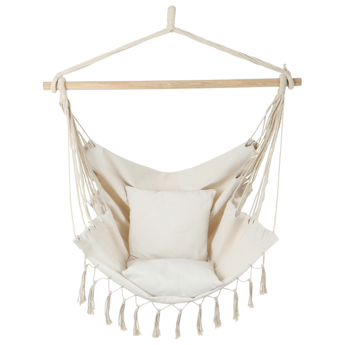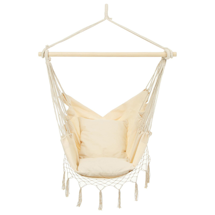 Гамак-кресло подойдёт для качания и отдыха на природе. В комплекте есть две мягкие подушки, которые обеспечивают дополнительный комфорт. Прочный материал выдерживает высокую нагрузку. Благодаря компактному размеру и простой конструкции он удобен в хранении, транспортировке и установке.