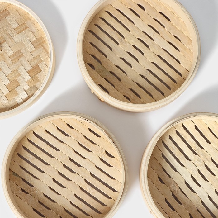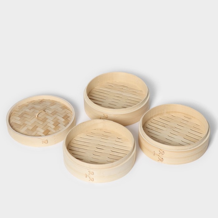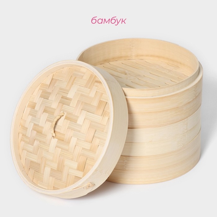 Конструкция из бамбуковых ёмкостей предназначена для приготовления пищи на пару. Резервуаром для воды в данном случае выступает кастрюля или сковорода WOK (в комплект не входит). Обработка паром сохраняет полезные свойства продуктов, делает блюда сочными и нежными. Изделие подходит для приготовления овощей, риса, рыбы и мяса, пельменей, мантов и хинкалей.