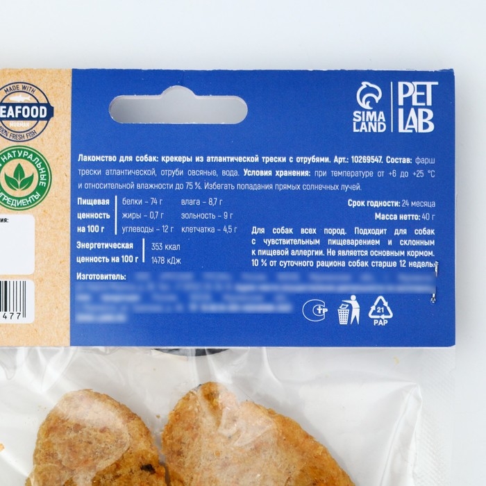 Лакомство для собак натуральное PetLab: Крекеры из трески с отрубями, 40 г.