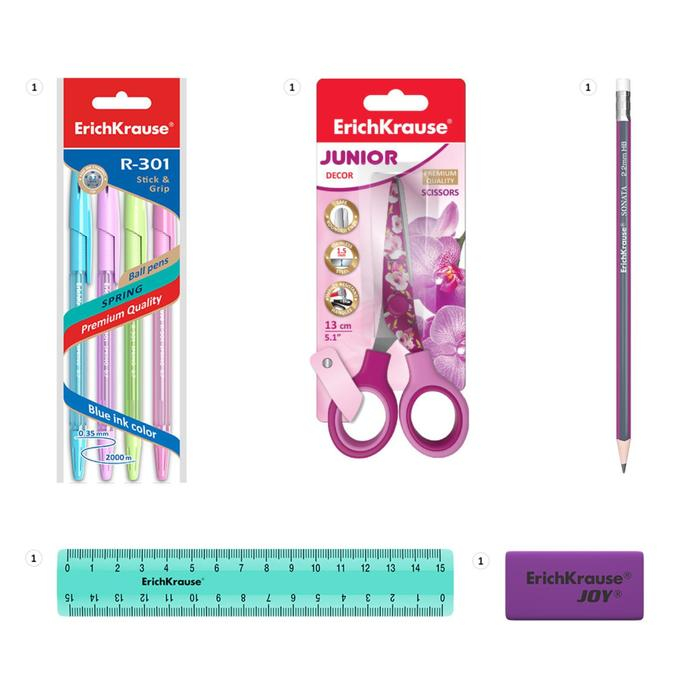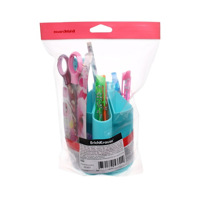 Готовый набор с наполнением. Подставка оснащена вращающимся механизмом и изготовлена из высококачественного пластика. В комплекте 8 предметов: 4 ручки, карандаш, линейка, ластик, ножницы.