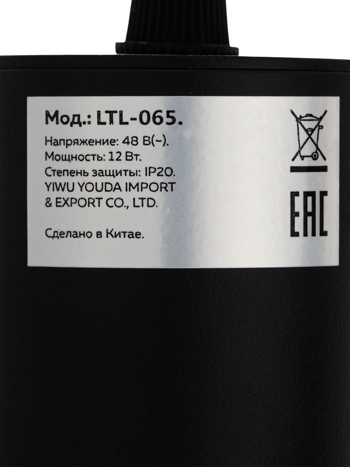 Трековый магнитный светильник, серия "Broad" LTL-065, 12 Вт, 960 Лм, 48В, 3000К, черный