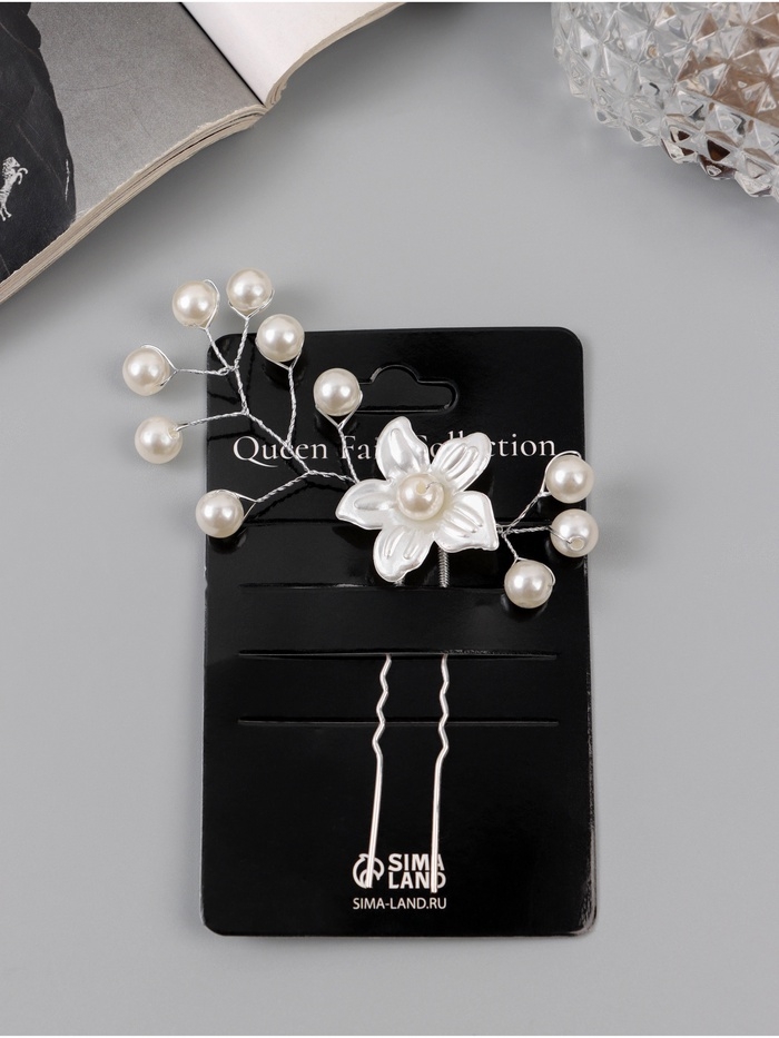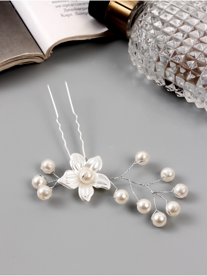 Шпилька для волос "Эмилия" цветок бусинки, 9х6 см, белый