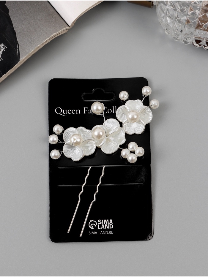 Шпилька для волос "Эмилия" резные цветы шарики, 9х6 см, белый