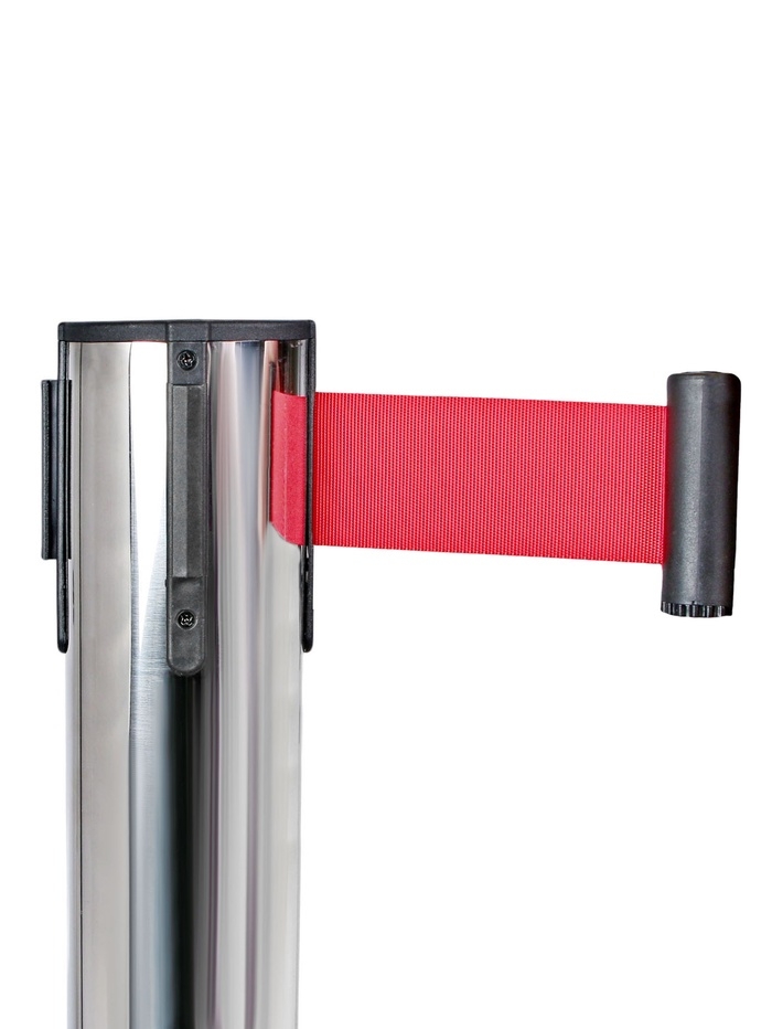 Стойка ограждения серебряная, с вытяжной лентой-180 см красная, белый, высота-90см, d- 6см, напольный d-32см