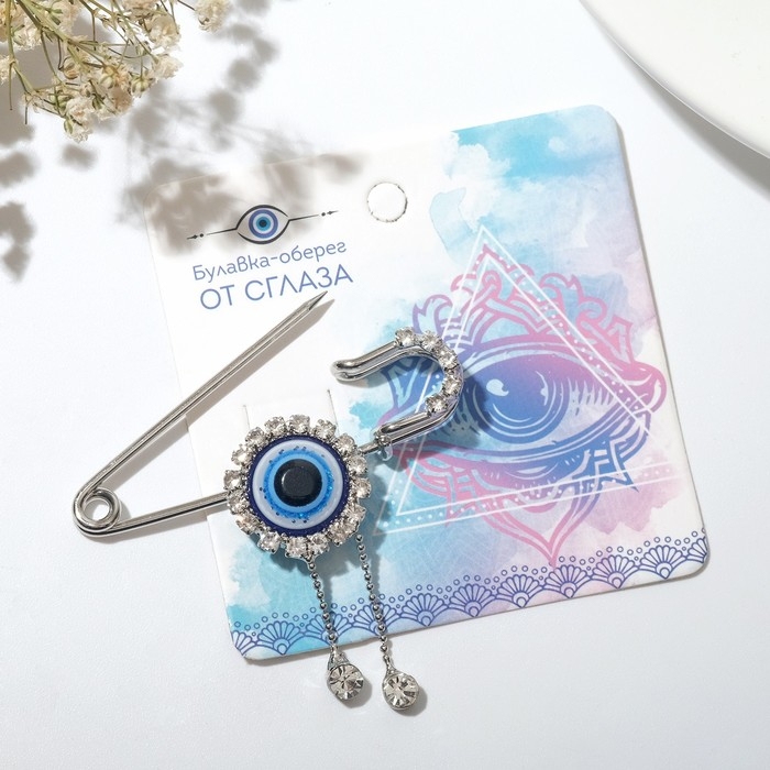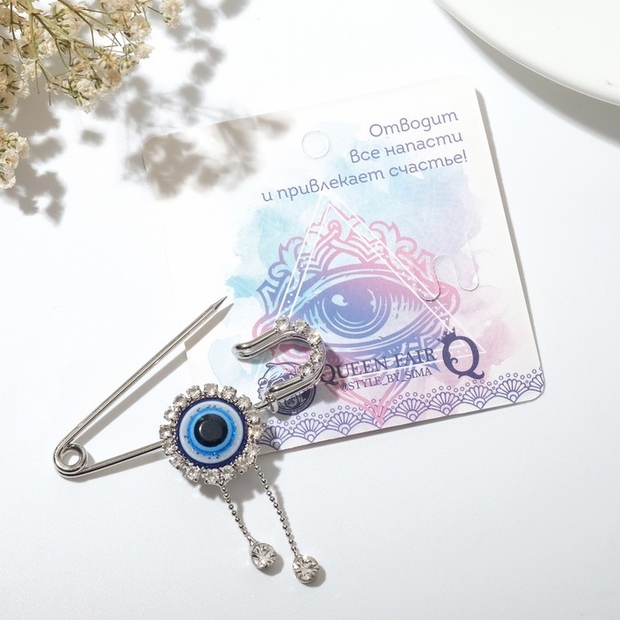 Булавка-оберег «От сглаза» глаз с подвесками, 5 см, цвет бело-синий в серебре