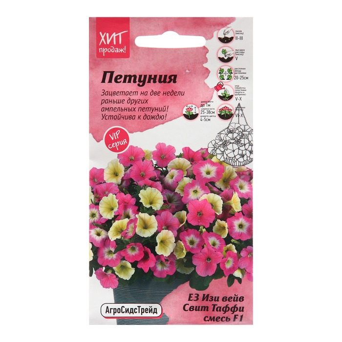 Знаменитый ампельный гибрид многоцветковой петунии, удивляющий своим обильным цветением от американской компании PanAmerican Seed. Характеризуется длительным периодом цветения и устойчивостью к неблагоприятным условиям. Дословно название серии переводится, как «легкая волна», это действительно так же красиво - целью селекции было создание легкого в уходе и хорошо растущего в условиях короткого светового дня растения. Ниспадающие плети покрыты множеством удивительных миниатюрных цветов. Данная серия наращивает массу растения сначала "куполом", достигая 25-38 см в ширину и диаметром 15-30 см, формируя в последствии плети до 1 метра, обильно усыпанные крупными цветками. Цветение обильное, длится с июня по октябрь. Этот уникальный гибрид позволяет создать изысканные и неповторимые композиции при оформлении клумб, рабаток, вазонов и кашпо. Также петунию данной серии смело можно сажать в балконные ящики. Агротехника: Семена покрыты оболочкой! Петуния – мелкосемянная культура, требовательная к условиям выращивания. Посев на рассаду в феврале-марте. Гранулы располагают на поверхности субстрата, не засыпая их почвой, а лишь слегка прижимают и накрывают стеклом или пленкой. Для прорастания семян необходимо хорошее освещение и температура 20-24˚С. Полив производят из опрыскивателя. Всходы появляются на 10-15 день. После появления первого настоящего листа всходы проветривают, периодически снимая стекло и убирая конденсат влаги. Температуру постепенно снижают до 14-16˚С и следят, чтобы не было переувлажнения субстрата. Закаленную рассаду высаживают в грунт по схеме 25×30 см. В дальнейшем уход заключается в рыхлении, поливе и подкормах. Штрих-код –