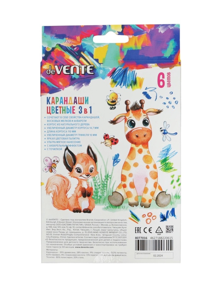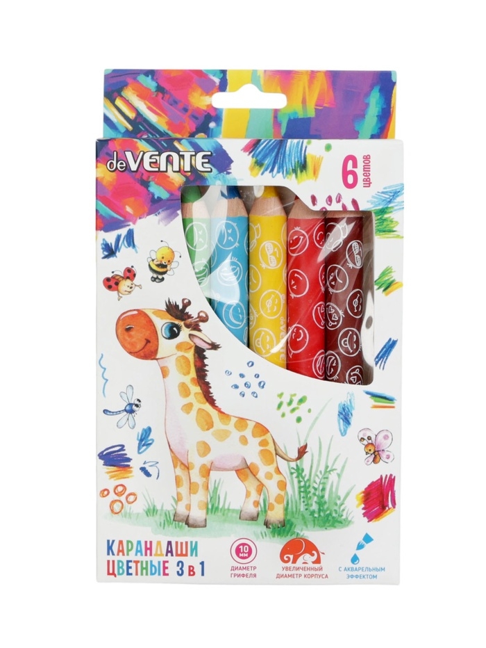 Карандаши акварельные 6 цветов, мини deVENTE Jumbo 3 в 1 супер мягкие, d-14.7 мм; L-110 мм с точилкой