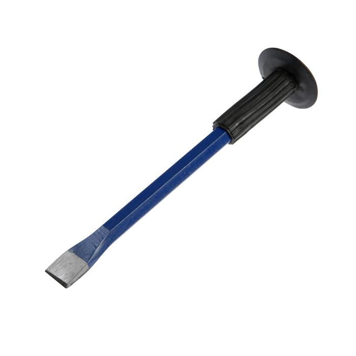 Зубило с протектором разрубает камни и цемент при демонтажных работах. Изготовлено из высококачественной стали, обладающей высокой прочностью. Инструмент оснащён резиновым протектором, который защищает от случайного попадания молотком по руке.