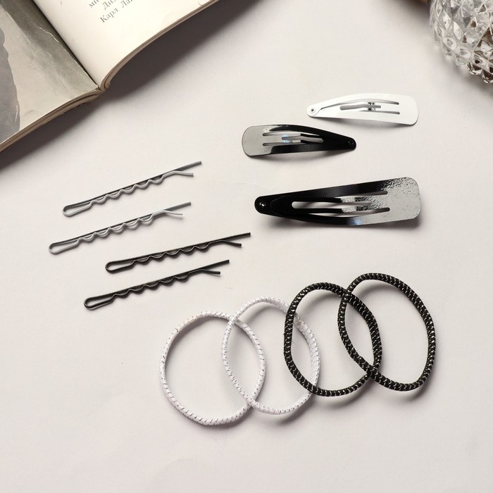 Набор для волос «Классика» (6 шт-4,5 см,8 шт-6 см,2 шт-6,5 см,8 резинок) чёрно-белый поможет сделать аккуратную и красивую причёску за считанные секунды. Маленькие помощники сохранят форму укладки и дополнят шевелюру как декоративные элементы. Сделайте образ ярким!