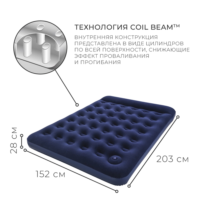 Когда нужно разместить гостей, но в доме нет лишнего спального места, вас выручит надувной матрас. Прочные перегородки внутри обеспечивают необходимую упругость. Встроенный ножной насос упрощает процесс установки. С велюрового покрытия, приятного на ощупь, не скатывается постельное бельё. Изделие имеет сдержанный дизайн, классическая расцветка позволяет ему хорошо вписываться в любой интерьер. Данную модель можно назвать настоящей надувной кроватью, так как она не уступает в комфорте обычным пружинным матрасам. Подходит также для использования на открытом воздухе.