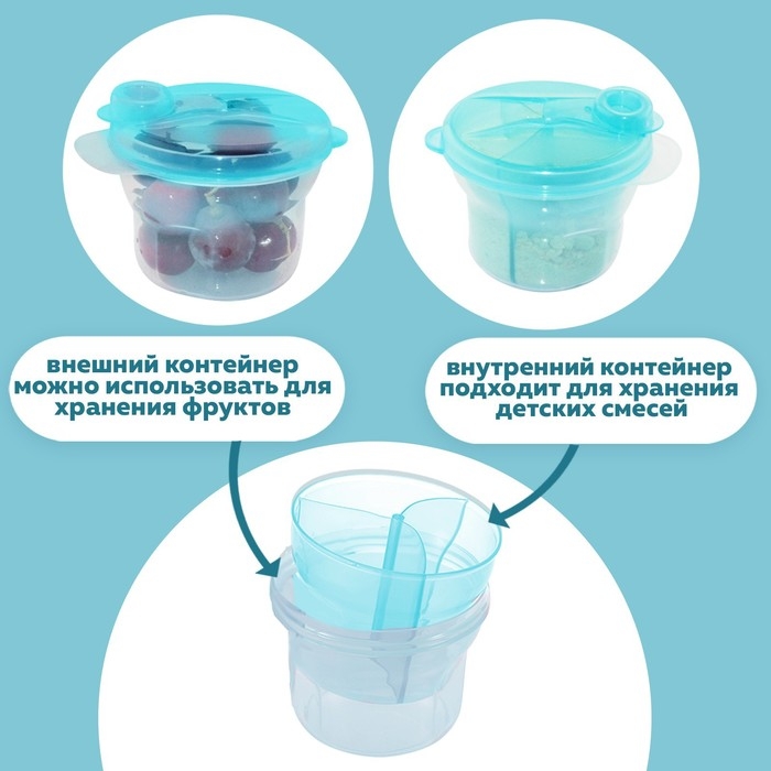Контейнер подходит для хранения детского питания . Благодаря плотно закрывающейся крышке и ложке удобно пользоваться как дома, так и в дороге. Компактная ложечка позволяет заранее отмерять и хранить определенное количество сухой смеси. Такой контейнер позволит вам быстро и без задержек приготовить питательную смесь для малютки. Выполнено из безопасных материалов.