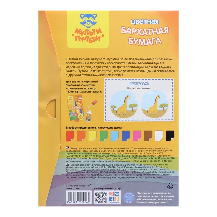 Бумага цветная бархатная А5, 10 листов, 10 цветов Мульти-Пульти, в папке
