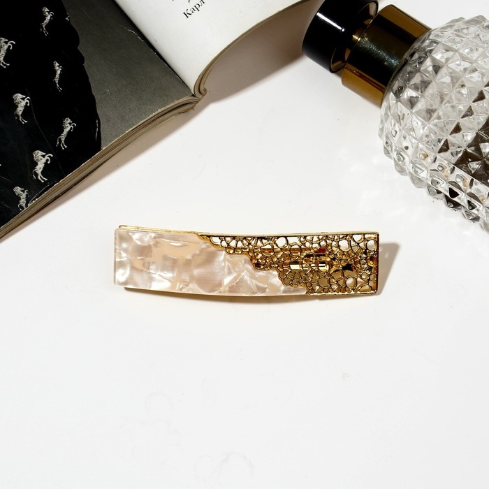 Заколка-автомат «Геометрия» помогает создавать аккуратные и модные причёски. Бежевый и золотистый цвета делают её универсальной, подходящей к любому наряду. Прямой кружевной дизайн добавляет элегантности, а надёжная фиксация обеспечивает комфорт на целый день. С этой заколкой женщина всегда будет выглядеть ухоженно и стильно.