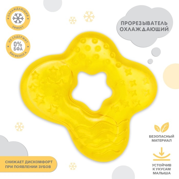 Специальная жидкость внутри поможет снизить воспаление в ротовой полости и снять болевые ощущения. Для охлаждения прорезывателя поместите его в холодильник на 10‒15 минут. Форма ручки и размеры разработаны специально для детской ладони, поэтому малышу будет удобно её держать. Рельефная структура на поверхности изделия и его дополнительных элементов будет способствовать развитию мелкой моторики, а яркие цвета — формированию визуального восприятия мира.