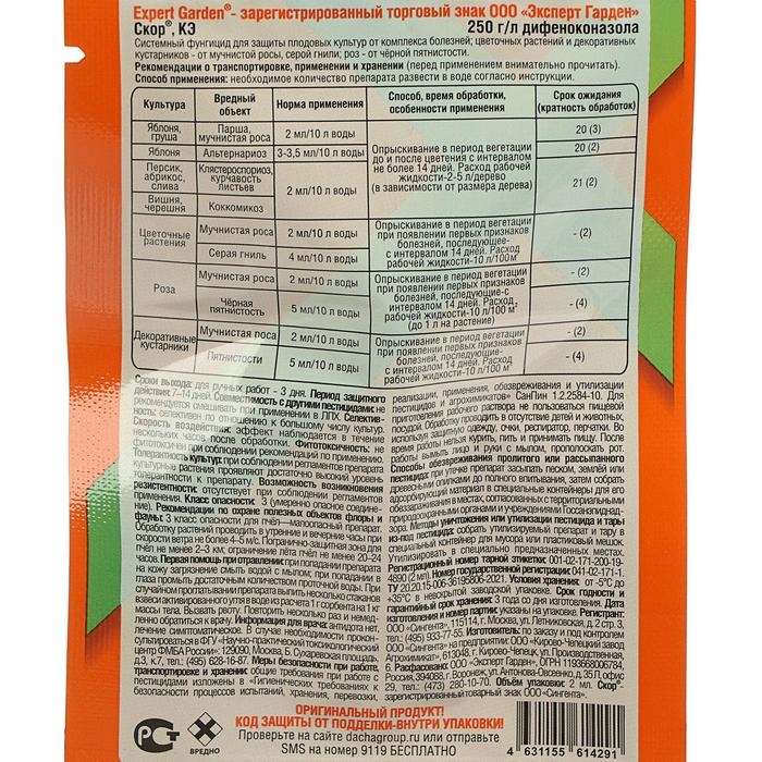 Скор — контактный и системный фунгицид, способный предотвратить и вылечить многие заболевания растений — мучнистую росу, паршу, серую гниль, фитофтороз, бурую ржавчину, коккомикоз, курчавость листьев, альтернариоз, корневую гниль, клястероспориоз, плесневение семян. Этот препарат представлен в виде раствора 2 мл в ампуле, разводится в зависимости от заболеваний — для лечения парши, курчавости листьев, мучнистой росы — 2 мл/10 л воды, пятнистости — 5 мл/10 л воды, серой гнили и альтернариоза — 3-4 мл/10 л воды. Применяется для обработки плодовых деревьев, томатов, картофеля, винограда, огурцов. Проникает в ткани растения и начинает действовать уже через 2 часа. Продолжительность воздействия 7-10 дней.