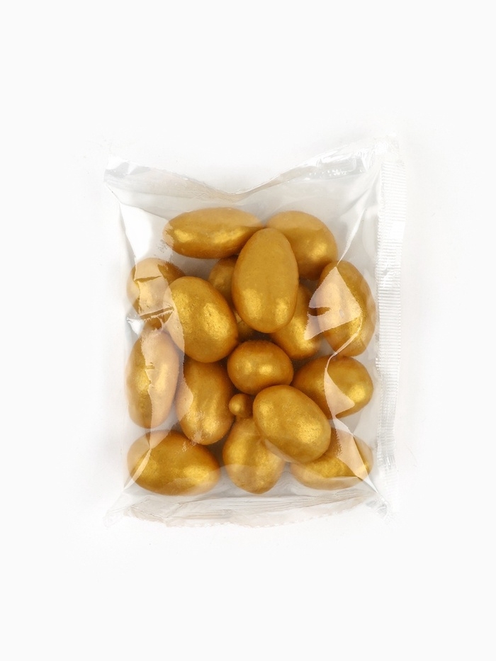 Состав: шоколадная глазурь (сахар, эквивалент какао-масла, какао тертое, какао-порошок, эмульгатор - лецитин, ароматизатор, идентичный натуральному - ванилин), миндаль, глянец - комплексная пищевая добавка "Капол", пигмент - золото.
