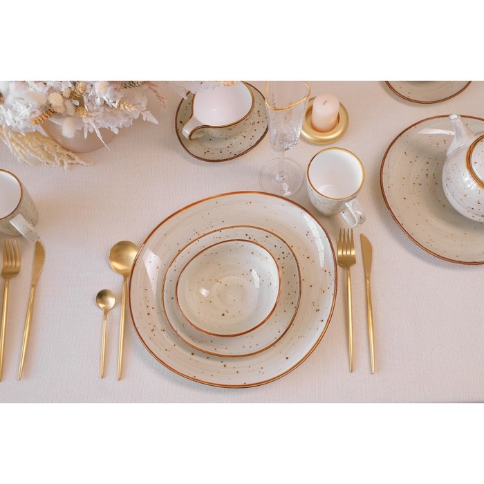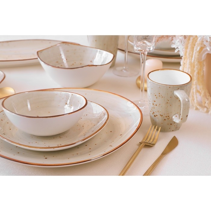 Фарфор этой коллекции отличается неповторимым цветом: нежный бежевый в крапинку. Такое цветовое решение делает каждую тарелку, кружку, блюдце или салатник настоящим произведением искусства.
