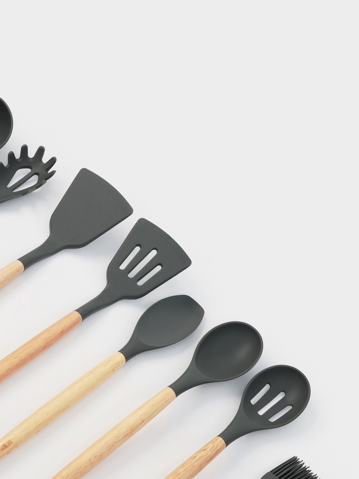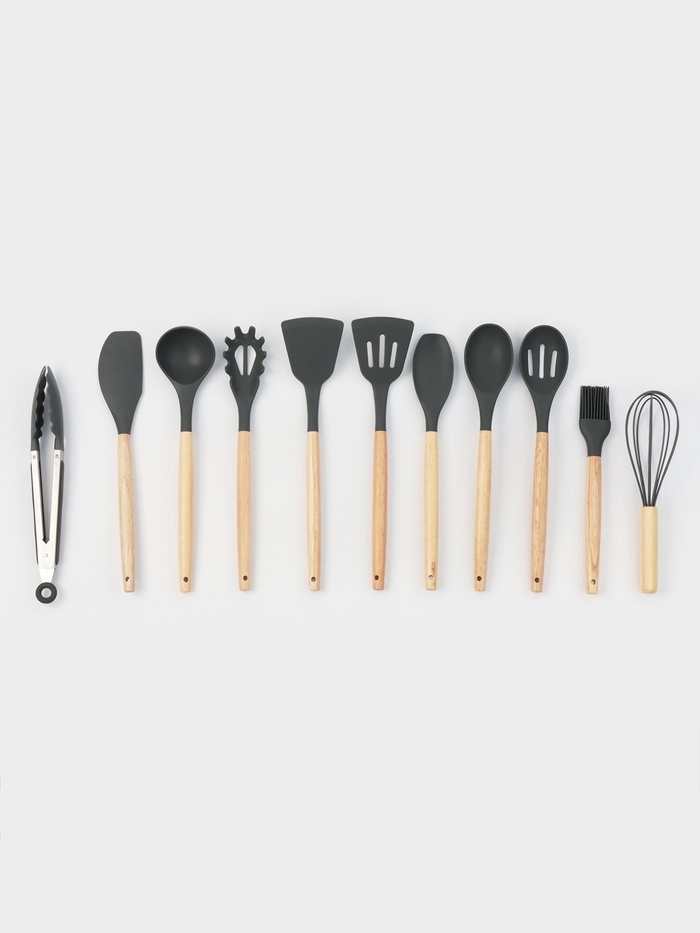 Представьте: вы с легкостью готовите любимые блюда, используя каждый из 12 предметов этого элегантного набора. Серые силиконовые рабочие части идеально сочетаются с деревянными ручками, создавая стильный и функциональный комплект. В наборе есть все необходимое: лопатки, половники, ложки, венчик, кисть, щипцы и удобная подставка для хранения.