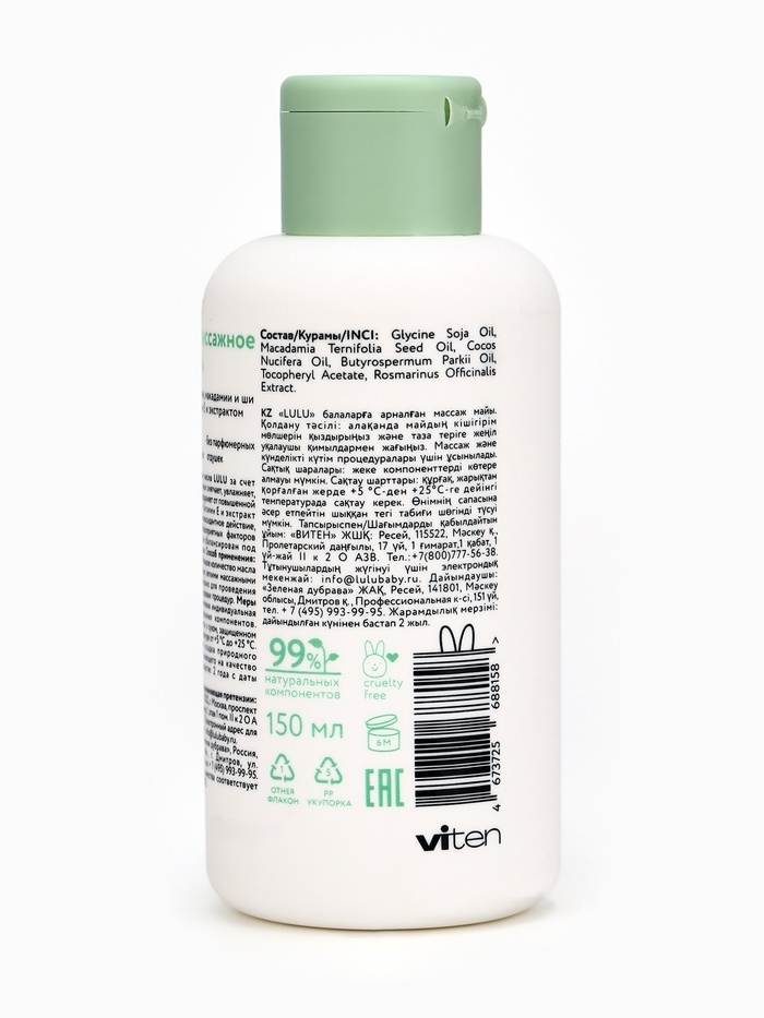Массажное масло LULU состоит на 99% из натуральных ингредиентов и содержит комплекс натуральных масел, которые смягчают, увлажняют и питают кожу малыша, предотвращая повышенную сухость и шелушение.
