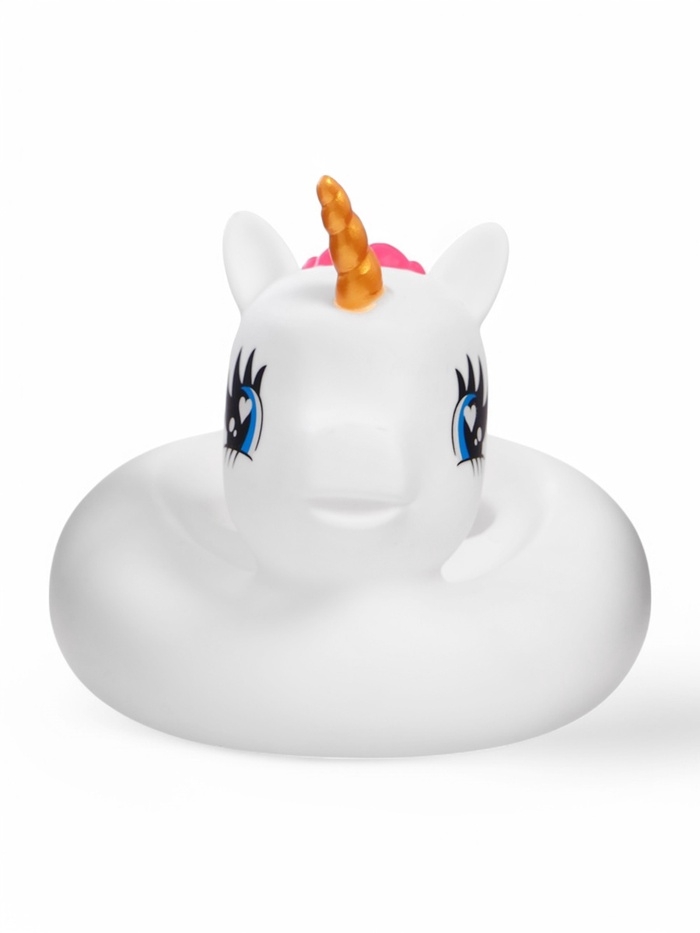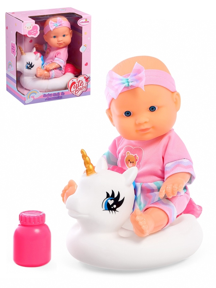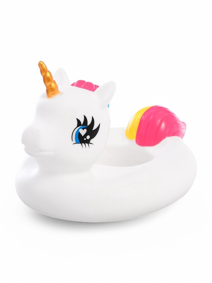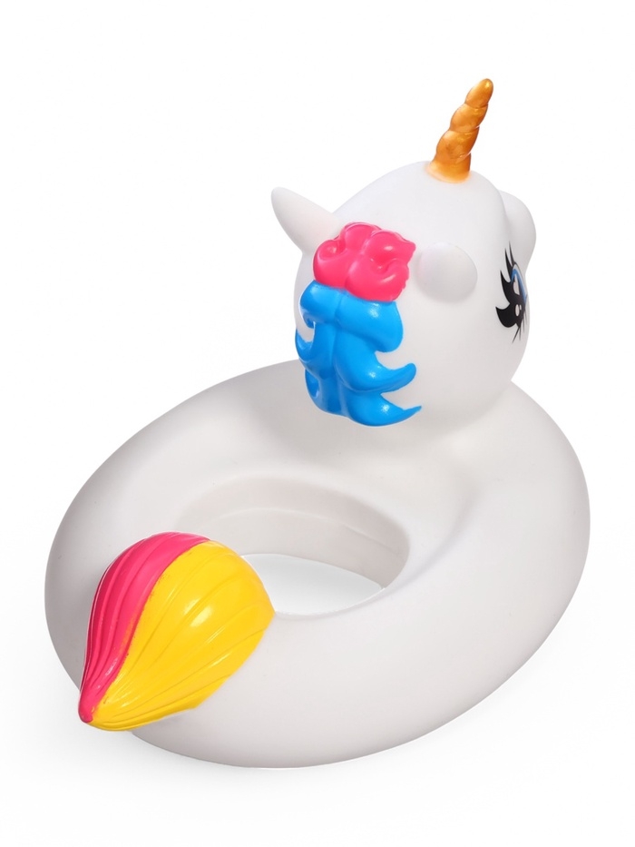 - В комплекте аксессуары для купания: баночка и круг-единорог.