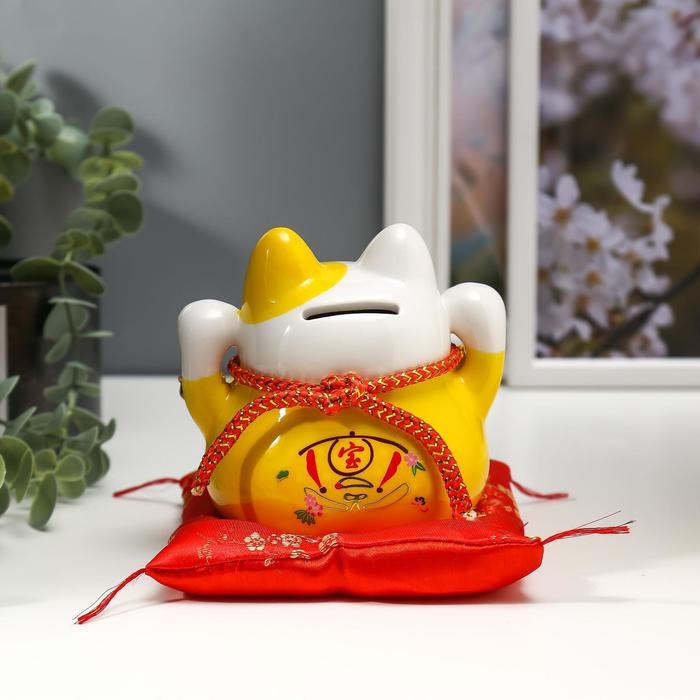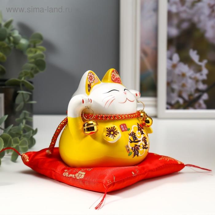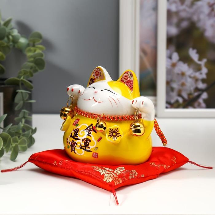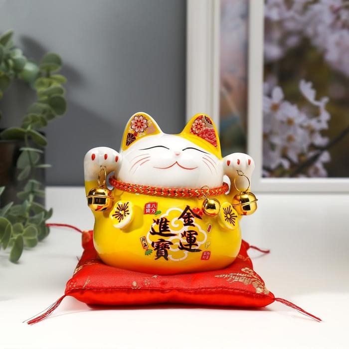 Сувенир керамика копилка "Жёлтый кот Манэки-нэко с колокольчиками" 11,5х11,5х9,5 см