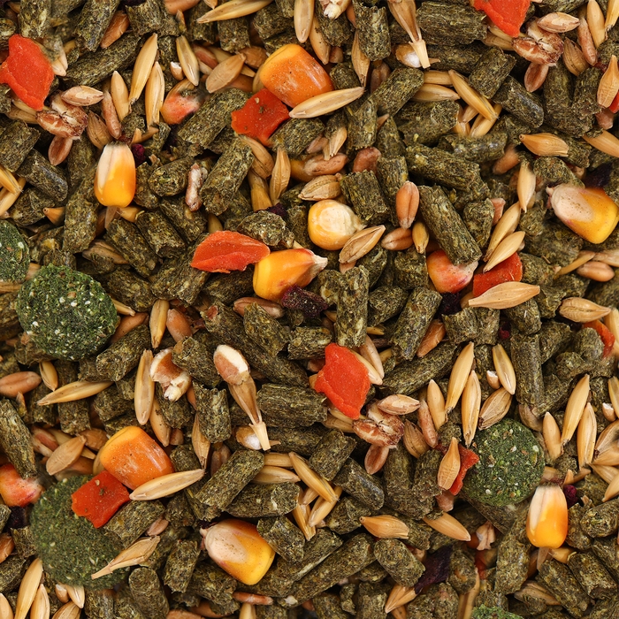 СОСТАВ: травяные гранулы,овес,кукуруза ячмень, пшеница, морковь, свекла, гранулы экструдированные.