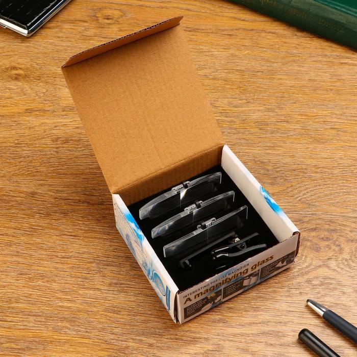 Лупа налобная с прищепкой на очки 3,5х, 2,5х, 1,5х (3 сменные насадки 7.5*2.8cм)