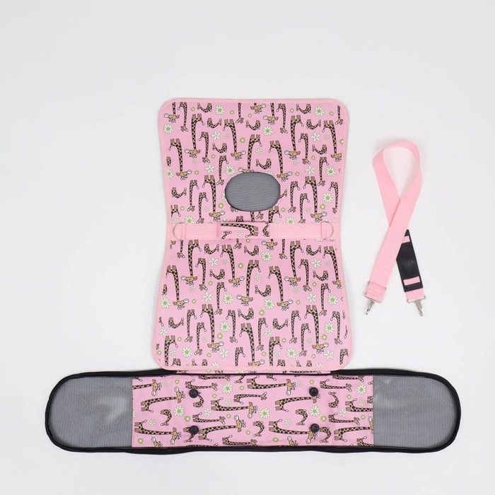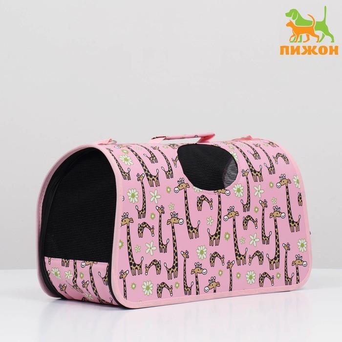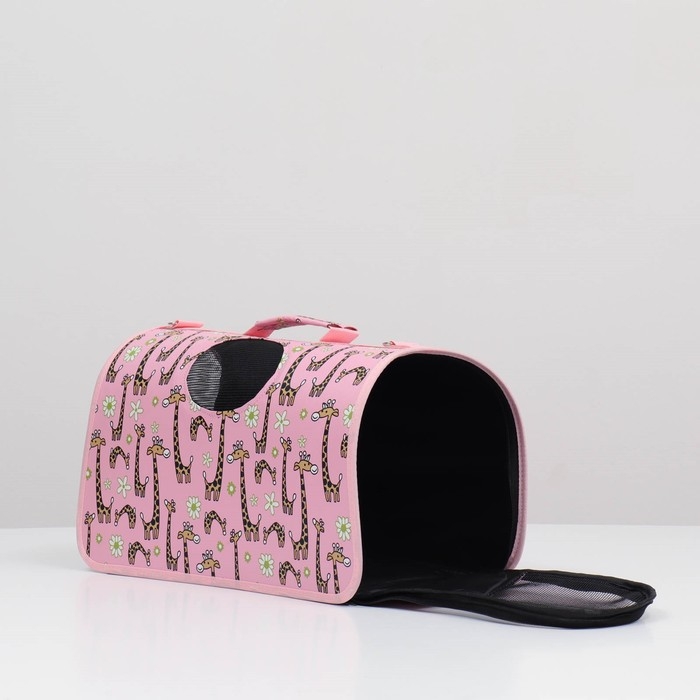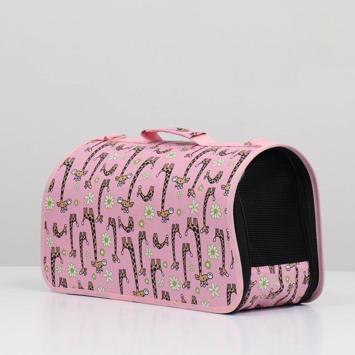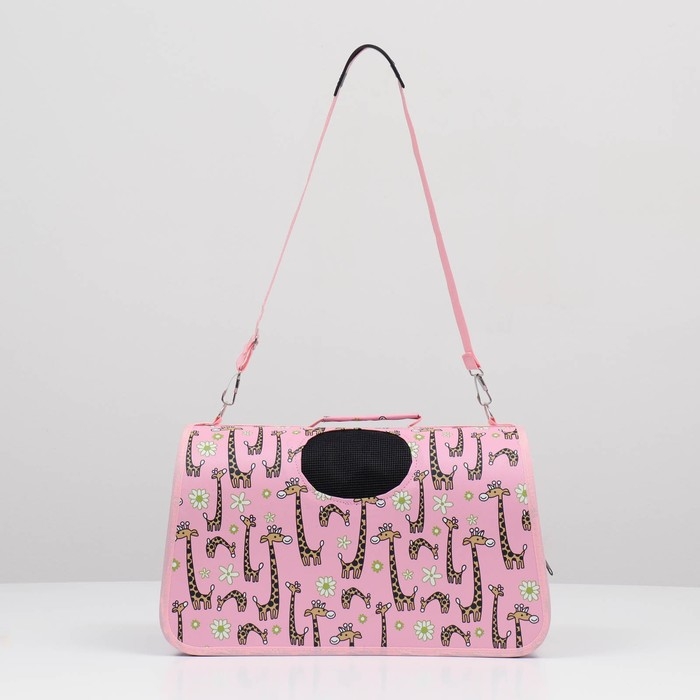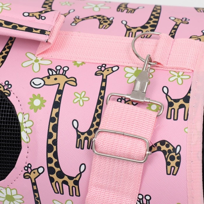 - Яркий розовый цвет и рисунок жирафов делают переноску стильным аксессуаром.