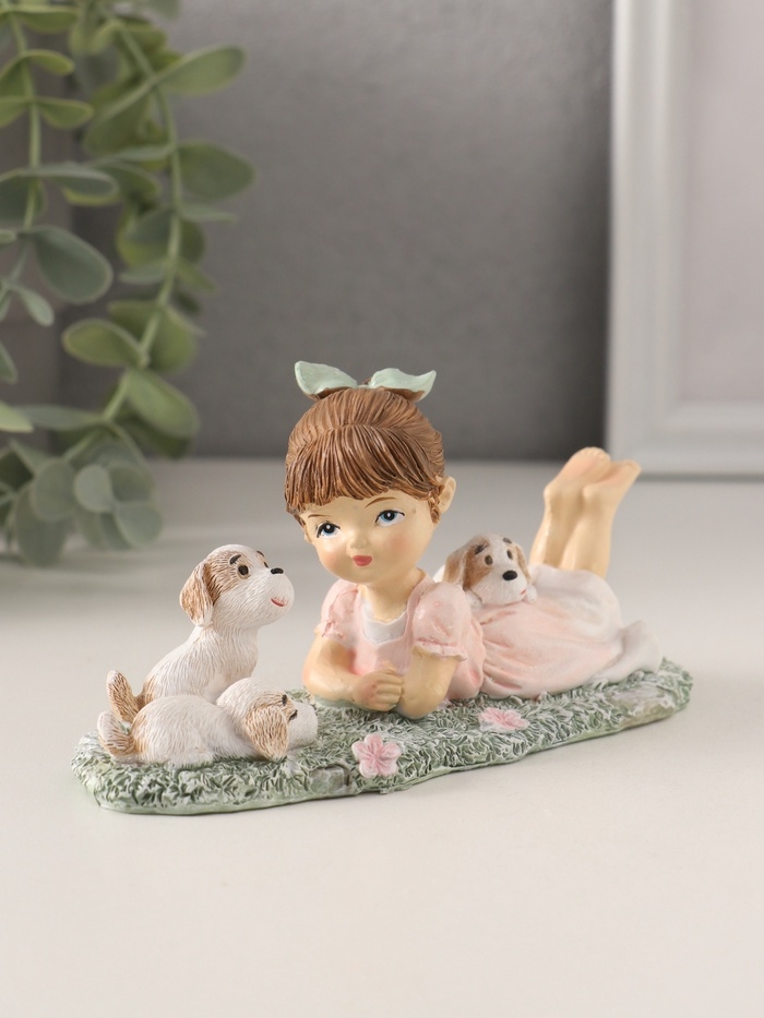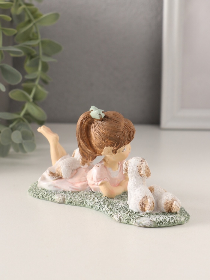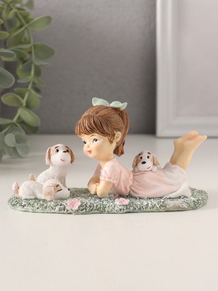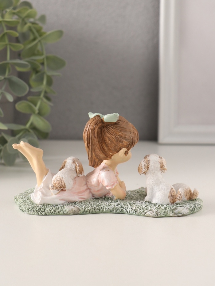 Сувенир полистоун "Малышка в розовом платье на лужайке с щенятами" 13х6х7 см