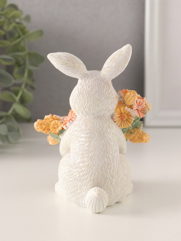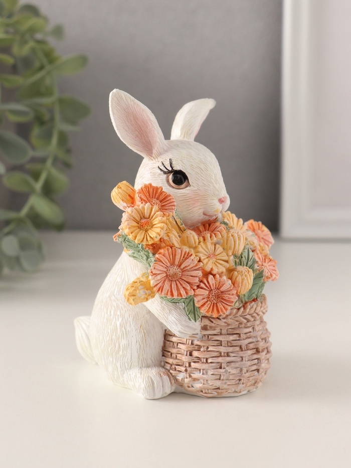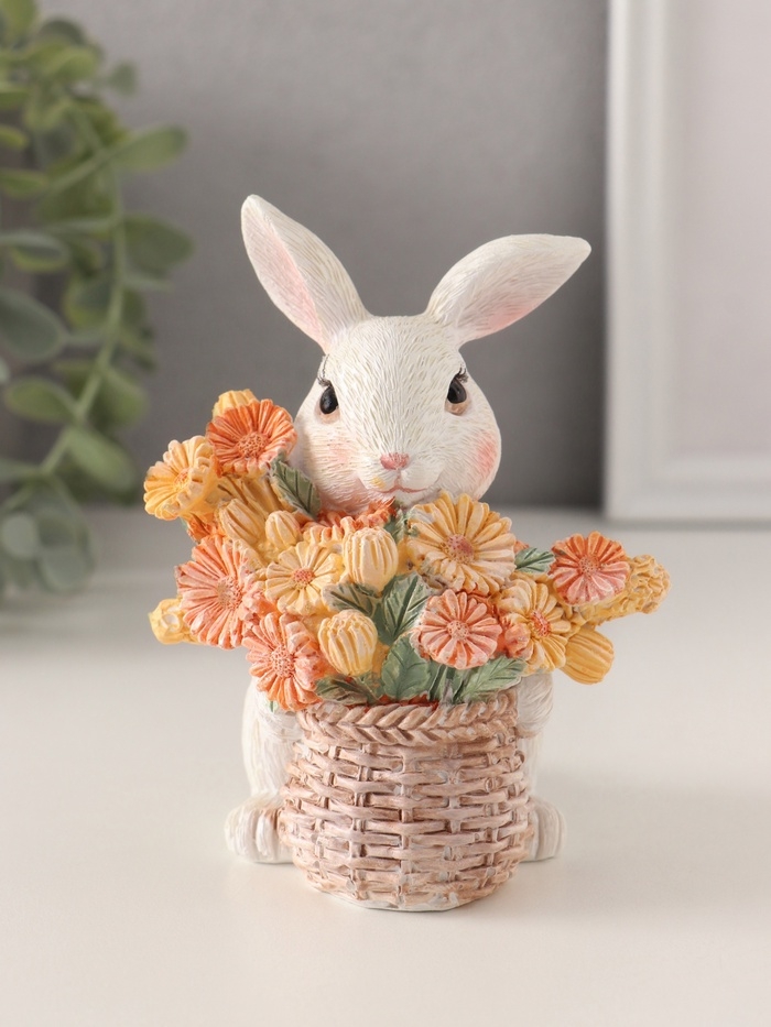 Сувенир полистоун "Белый кролик с цветами в плетённой корзине" 9х8,5х11,5 см