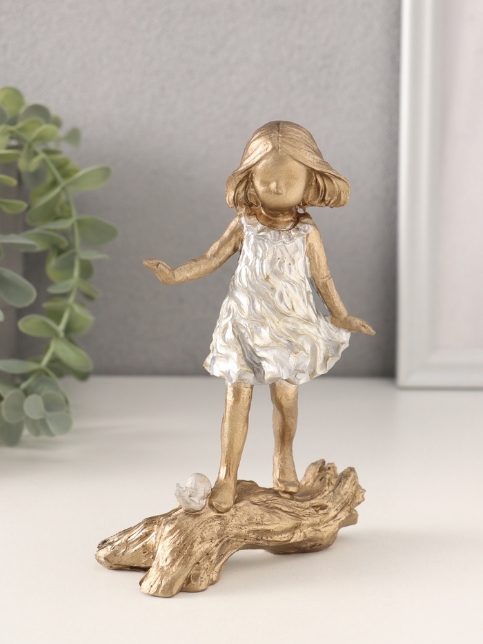Сувенир полистоун "Малышка с улиткой на коряге" бронза с серебром 9,5х4,5х15 см