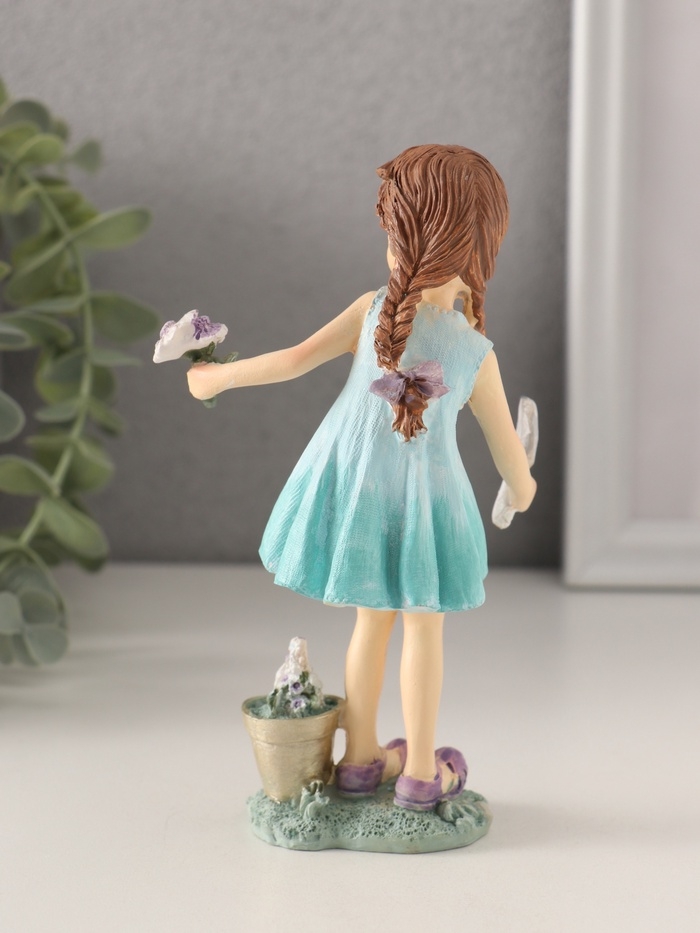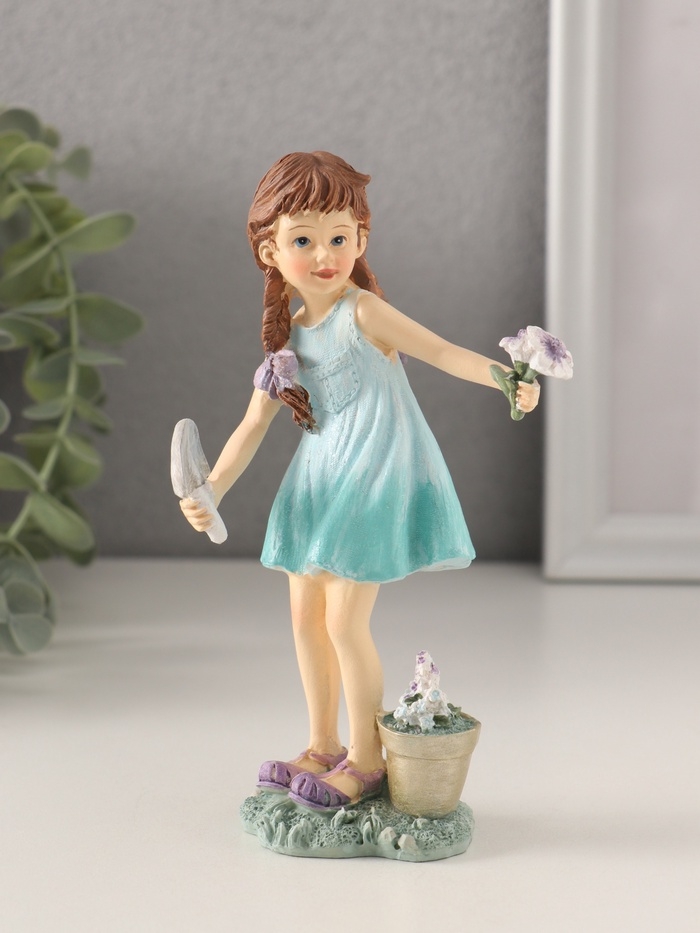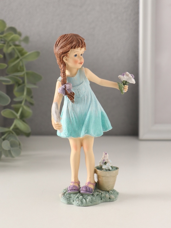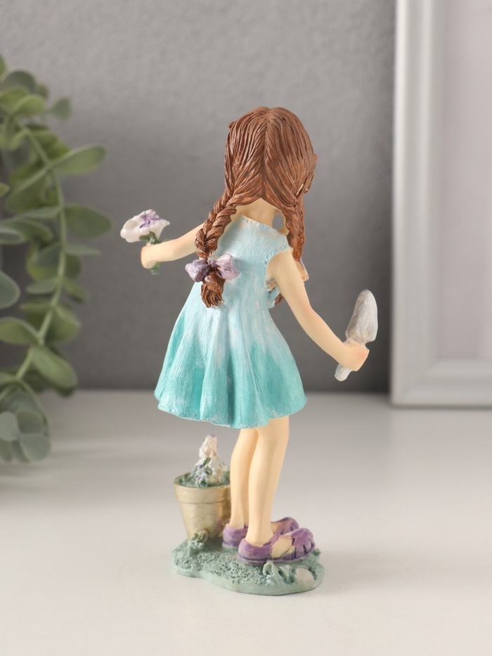 Сувенир полистоун "Девочка в бирюзовом платье, садит цветочки" 8х5,5х14,5 см