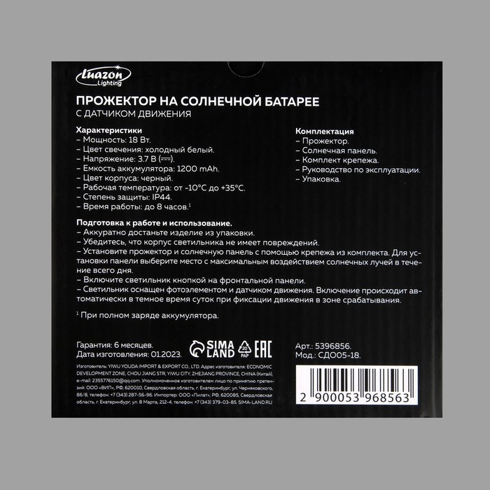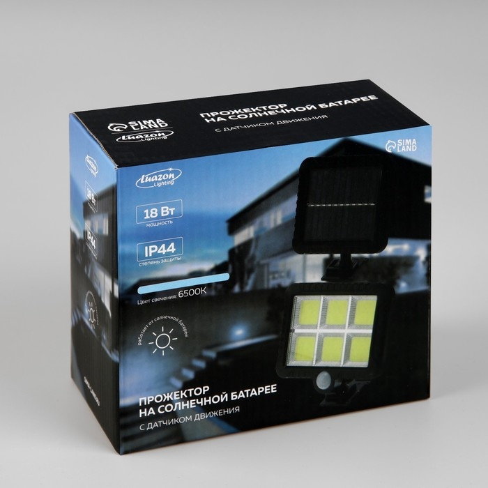 Светодиодный прожектор на солнечной батарее 18 Вт, выносная панель, 15×11×4 см, 6500К