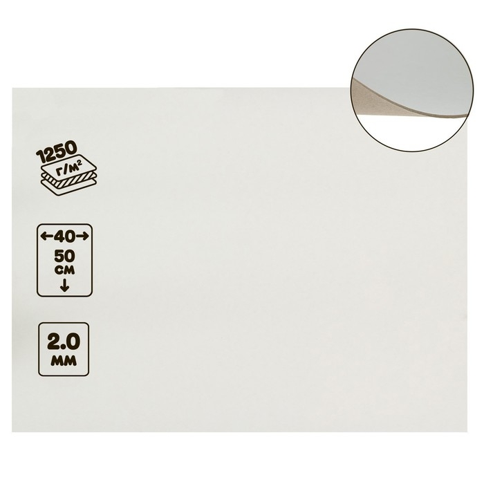 Картон переплётный (обложечный) 2.0 мм, 40 х 50 см, 1250 г/м2, белый