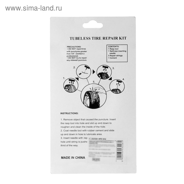 Набор-аптечка для ремонта бескамерных автомобильных шин незаменим в случае, если нужно самостоятельно устранить прокол или порез - в том числе, в дорожных условиях. С помощью входящих в комплект для ремонта компонентов - приспособлений для зачистки проколов и вставки жгутов, а также непосредственно жгутов-шнуров и тубы клея - можно оперативно восстановить целостность шины своими руками, не прибегая для этого к услугам шиномонтажа. Жгуты и клей для ремонта шин своими руками поставляются упакованными в блистер; универсальный компактный набор для ремонта проколов и боковых порезов бескамерных шин!