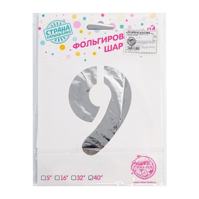 Шар фольгированный 40", цифра 9, цвет серебряный