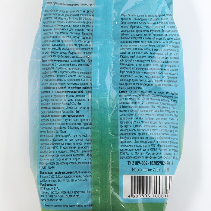 Состав: действующее вещество энтомопатогенный гриб Beauveriabassianasubsp. vivus с титром не менее 2×109 КОЕ/г.