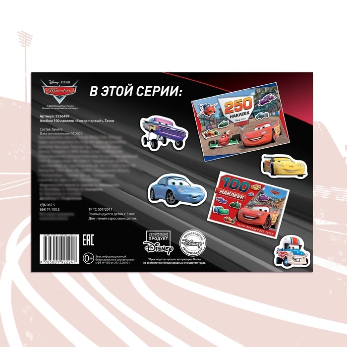 - В альбоме представлено 100 тематических наклеек с красочными изображениями героев мультфильма «Тачки».